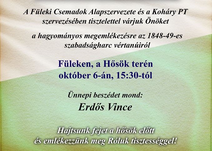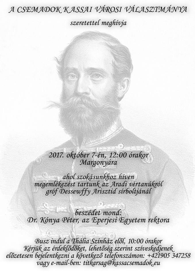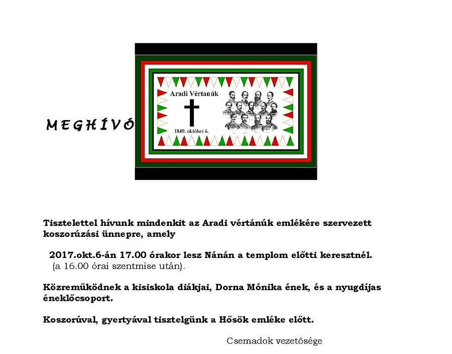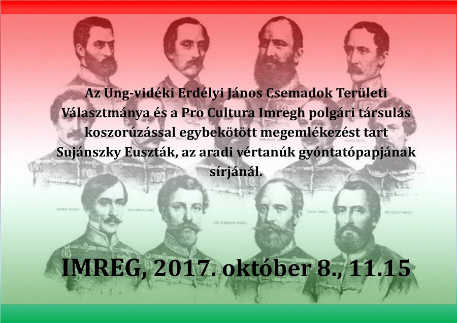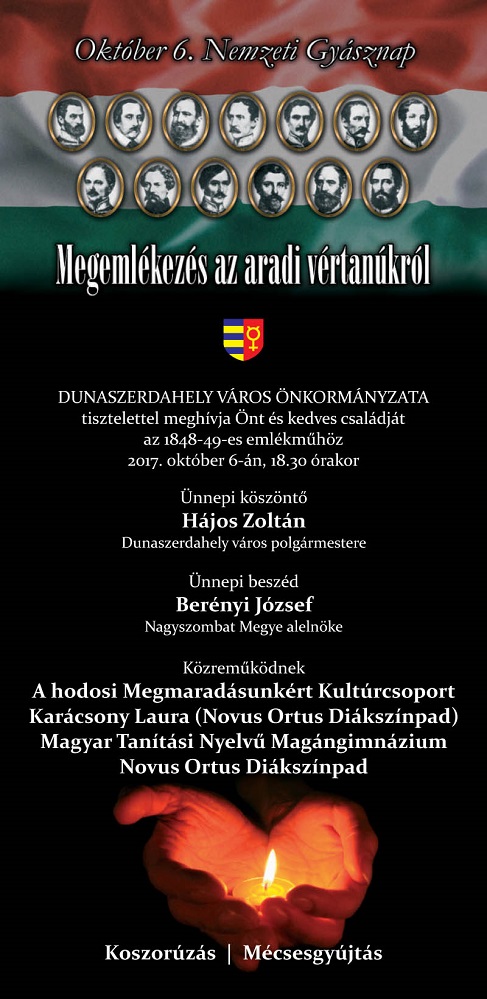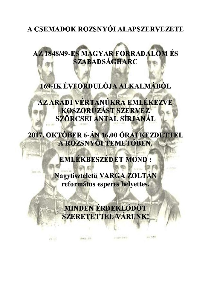 Almágy község Önkormányzata, az Alapiskola és Óvoda Almágy, a Csemadok és a Magyar Közösség Pártja helyi alapszervezete ünnepi megemlékezést és koszorúzást tart az aradi vértanúk tiszteletére 2017. október 6-án (pénteken) 16:00 órai kezdettel.