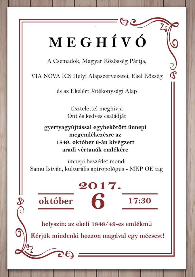 A Csemadok Ajnácskői Alapszervezete tisztelettel meghívja Önöket az aradi vértanúk emlékére tartandó ünnepi megemlékezésre és Gróf hernádvécsei és hajnácskői Vécsey Károly aradi vértanú emléktáblája avatására, amely október 6-án, pénteken 17:45-től kezdődik a templom melletti kopjafánál.