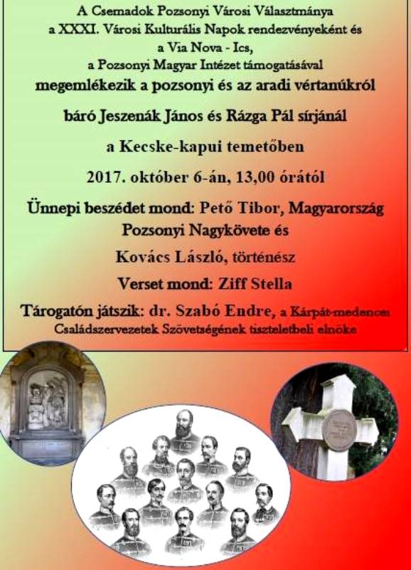 A Csemadok Párkányi Alapszervezete kegyeleti megemlékezést tart az ARADI VÉRTANÚK tiszteletére 2017. október 6-án /pénteken/ Párkányban a Kopjafánál.