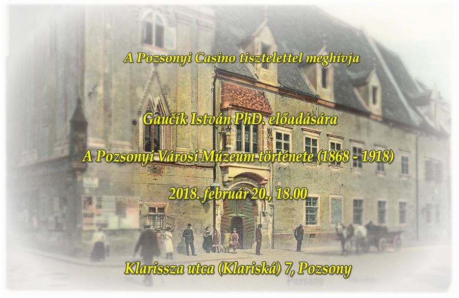 A Pozsonyi Casinóban (Klariská/Klarissza utca 7.) február 20-án, kedden 18.00 órától Gaučík István történész tart előadást az alapításának 150. évfordulóját ünneplő Pozsonyi Városi Múzeumról. Az érdeklődők az előadás során a múzeum 1868–1918 közötti időszakáról, az alapítókról, valamint a magyar állam korabeli kultúrpolitikájáról hallhatnak érdekes információkat. Műsorfelelős: Frideczky János, háznagy: Krajči Klára.