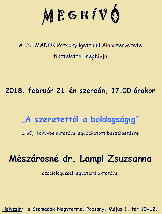 A Csemadok Pozsonyligetfalui Alapszervezete február 21-én, szerdán 17.00 órai kezdettel szervezi meg A szeretettől a boldogságig című, könyvbemutatóval egybekötött beszélgetését Mészárosné dr. Lampl Zsuzsanna szociológussal a Csemadok pozsonyi nagytermében (Május 1. tér 10–12.).