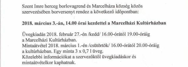 Marcelházán a Szent Imre herceg borlovagrend és Marcelháza község közös szervezésében kerül sor egy borversenyre. Részletek alább: