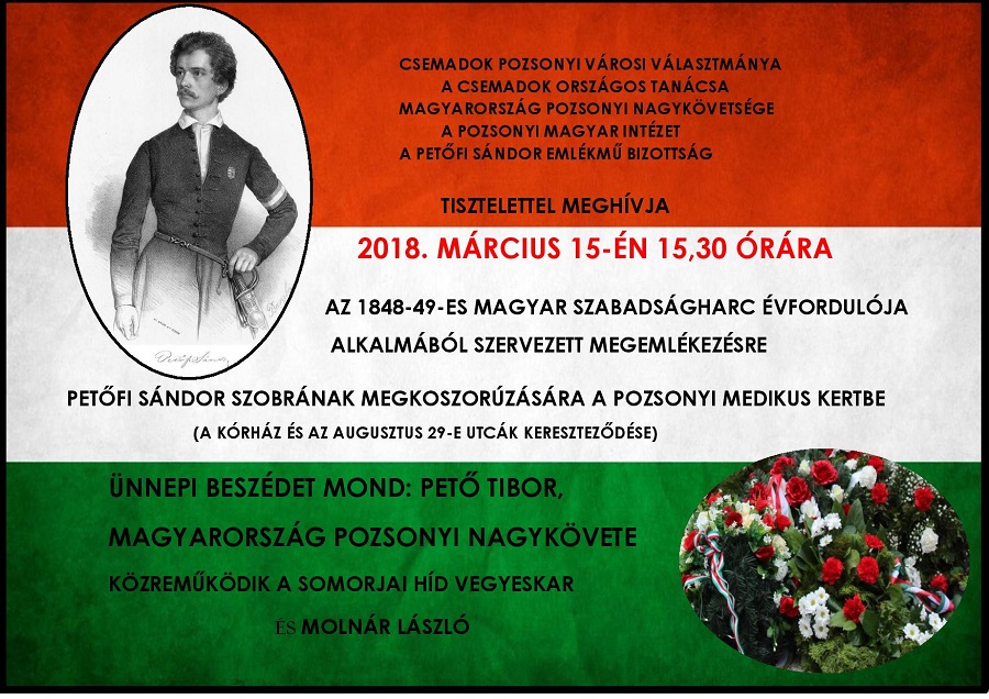 2018. március 15-én, csütörtökön 15.30 órától a pozsonyi Medikus kertben (Augusztus 29. utca) tartanak megemlékezést az 1848–49-es forradalomra. Petőfi Sándor szobrának megkoszorúzása alkalmából ünnepi beszédet mond Pető Tibor, Magyarország pozsonyi nagykövete. Közreműködik a somorjai Híd Vegyeskar.