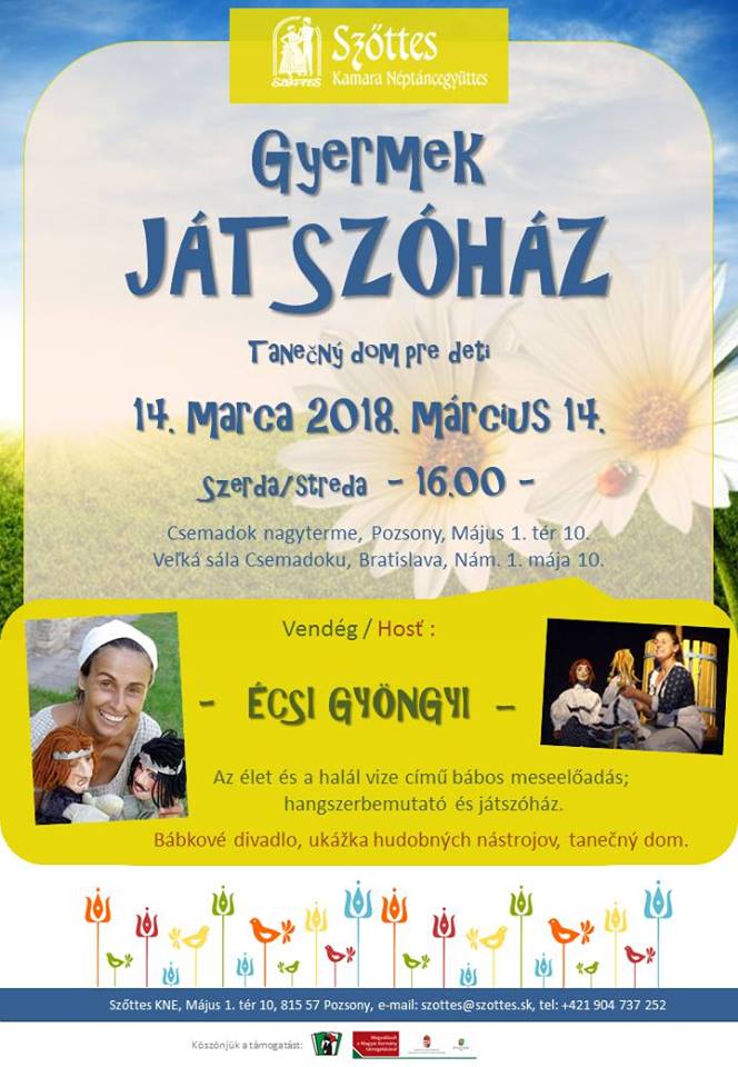 A Szőttes Kamara Néptáncegyüttes március 14-én, szerdán 16.00 órakor szervezi meg a Gyermek Játszóházat a Csemadok nagytermében (Május 1. tér/Námestie 1. mája). A rendezvény vendége Écsi Gyöngyi, aki „Az élet és a halál vize” című bábos meseelőadást adja elő.