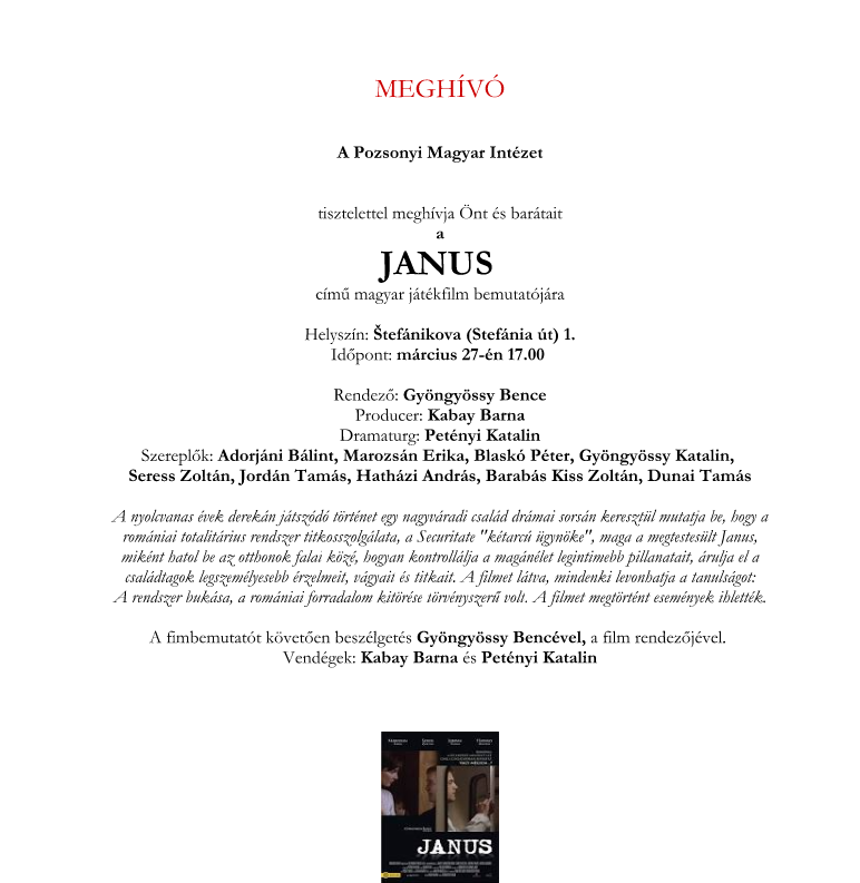 - március 27-én, kedden 17.00 órától vetítik a Pozsonyi Magyar Intézetben (Štefánikova/Stefánia út 1.) a Janus magyar nyelvű játékfilmet a Securitate működéséről.