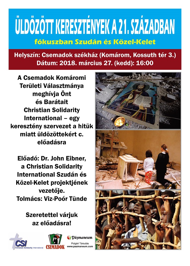 A Csemadok Komáromi Területi Választmánya március 27-én 16.00 órai kezdettel szervezi meg a Christian Solidarity International – egy keresztény szervezet a hitük miatt üldözöttekért című előadást a Csemadok komáromi székházában.