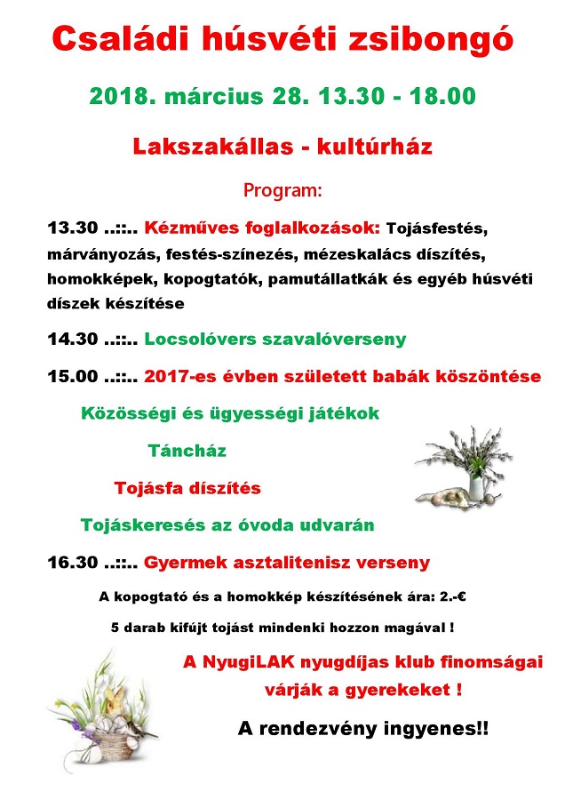 Családi húsvégi zsibongó várja az érdeklődőket Lakszakállason. Bővebb infó a plakáton: