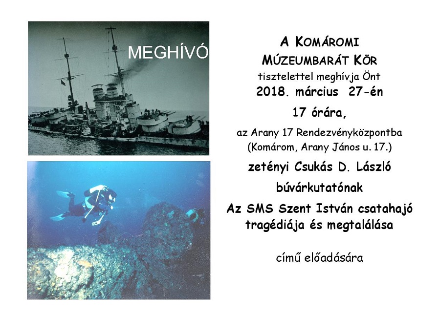 (Komárom, Arany János u. 17.) zetényi Csukás D. László búvárkutatónak „Az SMS Szent István csatahajó tragédiája és megtalálása” című előadására. bővebb infók itt.
