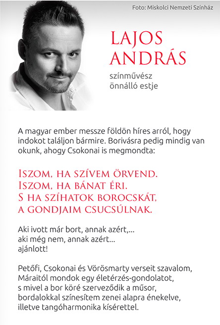 A CSEMADOK Városi Szervezete a magyar költészet napja alkalmából 2018. április 15-én, vasárnap 16.00 órai kezdettel irodalmi délutánt szervez IN VINO VERITAS címmel a Szenci Művelődési Központ Labirintusában. Az irodalmi délután vendége Lajos András színművész.