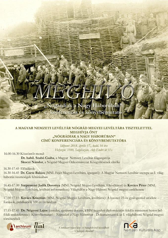 A közelmútban megjelent vaskos kötet az I. világháború nógrádi dokumentumait dolgozza fel. A bemutatóhoz kapcsolódó konferencián Szepessyné Judik Dorottya, a levéltár főlevéltárosa a „Nagy Háború Nógrád megyei emlékezetéről,“ Kovács Krisztián, levéltáros a losonci 25-ös gyalogezred utóéletéről tartanak előadást. Dr. Négyesi Lajos miniszteri biztos a könyvet mutatja be. Köszöntőt mondanak Dr. Szabó Csaba, a Magyar Nemzeti Levéltár főigazgatója és Skuczl Nándor, Nógrád Megye Önkormányzata Közgyűlésének elnöke.