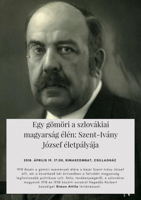1918 őszén a gömöri események élére a bejei Szent-Ivány József állt, aki a következő két évtizedben a felvidéki magyarság legfontosabb politikusa lett. Róla, tevékenységéről, a szlovákiai magyarok 1918 és 1938 közötti sorsáról Hegedűs Norbert beszélget április 19-én, csütörtökön 17.00 órától Simon Attila történésszel akinek Tóth Lászlóval közösen jegyzett könyve a közelmúltban jelent meg.
