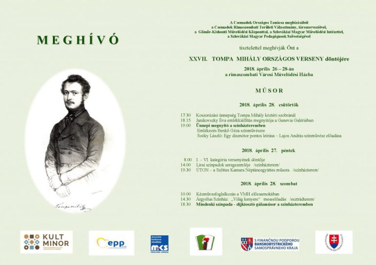 Április 26. és 28. között immár huszonhetedik alkalommal rendezik meg Rimaszombatban, a Városi Művelődési Központban a Tompa Mihály Országos Verseny döntőjét.