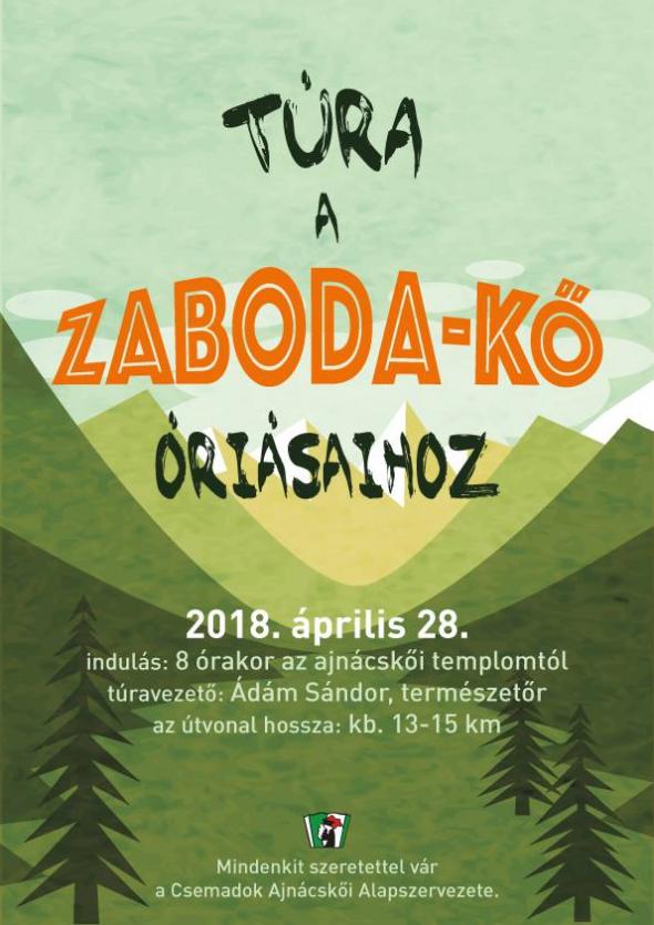 Az idén a Zaboda-kő bazaltóriásait látogatják meg, indulás 8.oo órakor az ajnácskői templom elől. A közepesen nehéz túrára várják a felnőtteket és nagyobb gyerekeket egyaránt. Az útvonal hossza kb. 13-15 km. Elemózsiáról, frissítőről mindenki maga kell, hogy gondoskodjon.