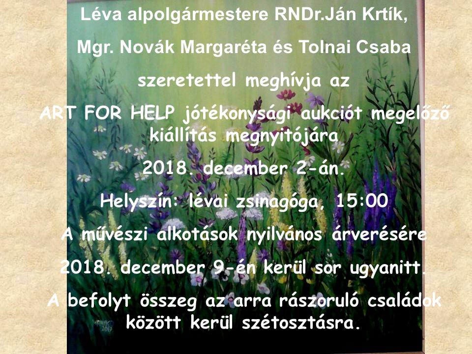 December 2-án kerül sor az Art for help elnevezésű jótékonysági árverést megelőző kiállítás megnyitójára a lévai zsinagógában. A művészeti alkotások árverésére december 9-én kerül sor, a befolyt összeget hátrányos helyzetű családok megsegítésére fordítják a szervezők.