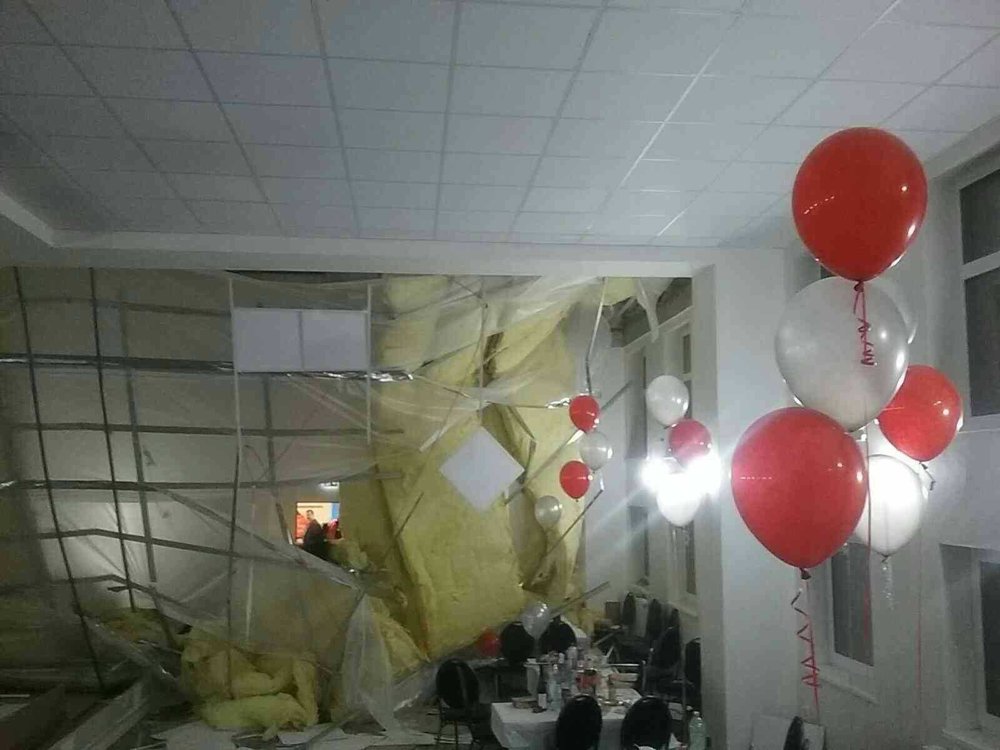5 ember szenvedett könnyebb sérüléseket, mikor éjjel 2 óra körül leszakadt a plafonra rögzített gipszkarton az alumínium konstrukcióval és a szigeteléssel együtt. A terem 30 x 12 méteres.