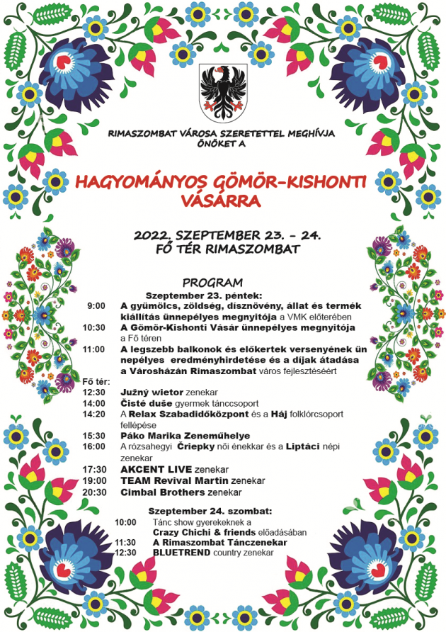 Szeretettel meghívjuk Önöket a hagyományos Gömör-Kishonti Vásárra, amelyre 2022. szeptember 23-án, pénteken és 24-én, szombaton kerül sor a Főtéren.