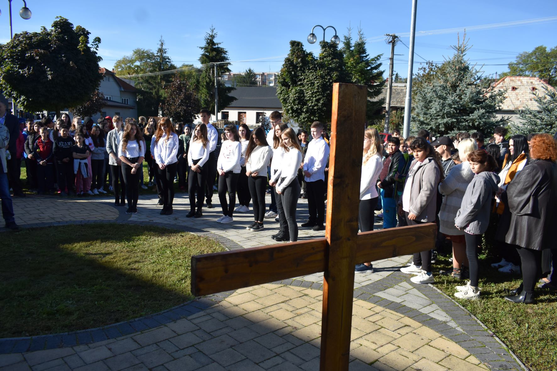 Agócs Ildikó megindító beszéde után az iskolások szavalatai, méltóságteljes tánca következett, majd a jelenlévők megkoszorúzták az emlékezés keresztjét és kopjafáját.