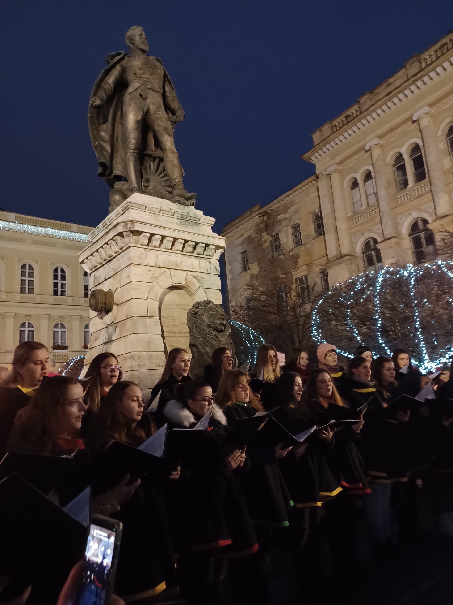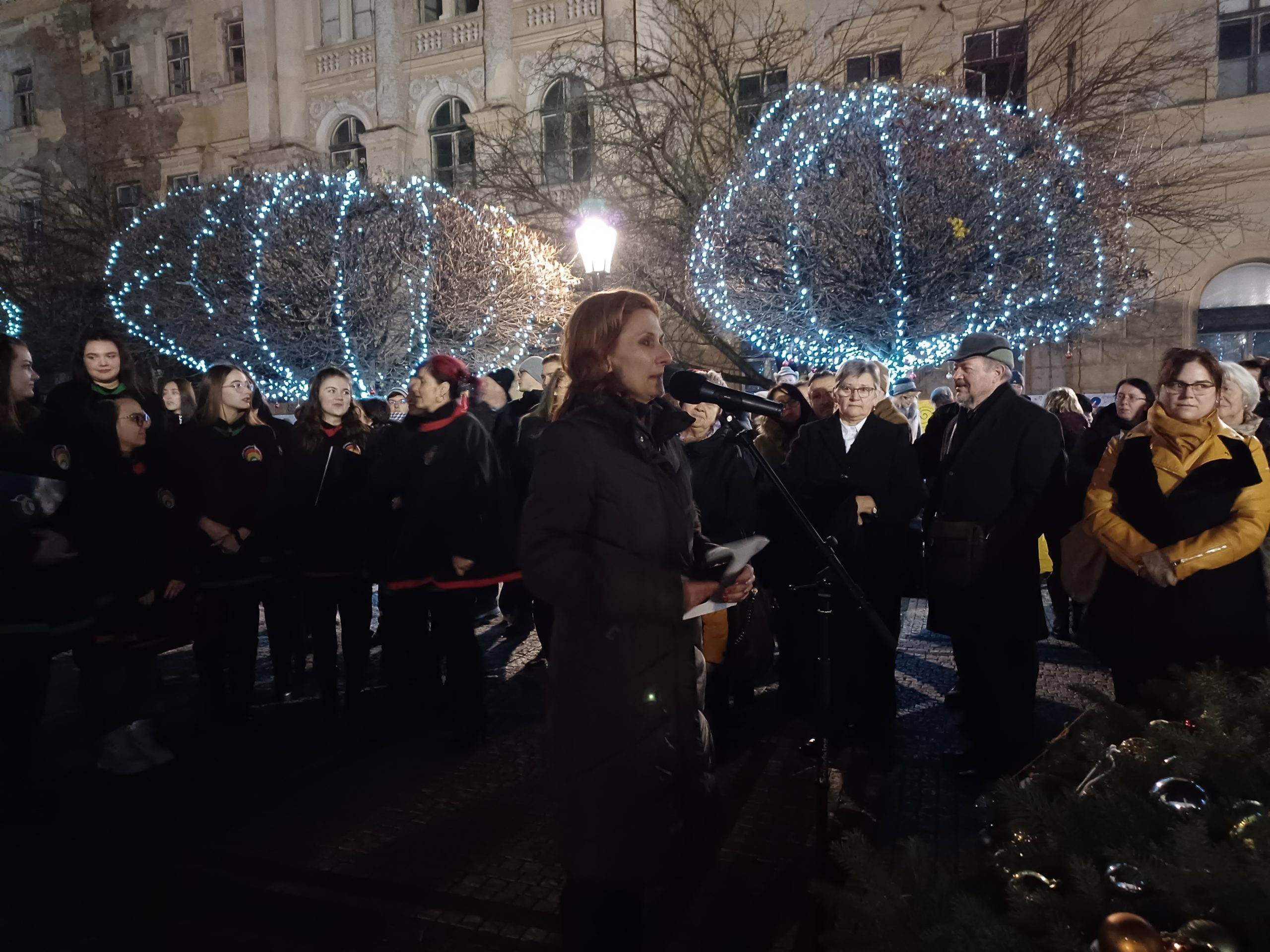 Mindezt azonban rövidesen ellensúlyozta a nagyon tartalmas, gazdag ünnepi műsor, amelyet a Cantus Iuventus, a Selye János Egyetem Női Kara varázsolt széppé Orsovics Yvette karnagy vezényletével. A gyönyörű dallamok hatását már csak Kristóf Réka operaénekes volt képes fokozni, aki szintén karácsonyi dallamokat adott elő. A Csendes éj felhangzásánál a hatalmas tömegen érezni lehetett az emelkedettség pillanatát.