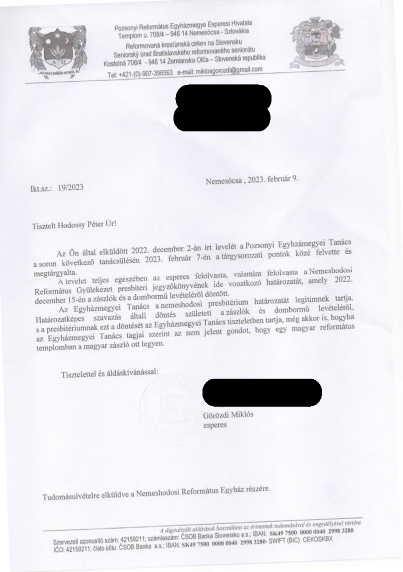 Hodossy Péter levélben fordult az Pozsonyi Református Egyházmegye Egyházmegyei Tanácsához jogorvoslatért.