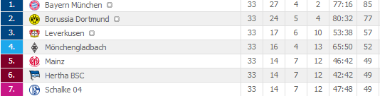A dobogó harmadik fokára a Leverkusen állhat, remek hajrájának köszönhetően. Zsinórban hét megnyert mérkőzésével már két fordulóval a vége előtt bebiztosították harmadik helyüket a tabellán. Mexikói támadójuk Javier Hernandez bőven kivette a részét a gólszerzésből, összen 17 alkalommal talált a kapuba.