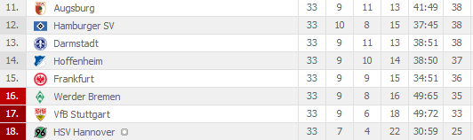 Az egyetlen osztályozót érő helyen jelenleg a Werder Bremen együttese áll, akik az utolsó fordulóban épp az előttük álló Frankfurt együttesét fogadják a kiesési rangadón. Amelyik gárda veszít, biztosan osztályozót játszik vagy kiesik az élvonalból.