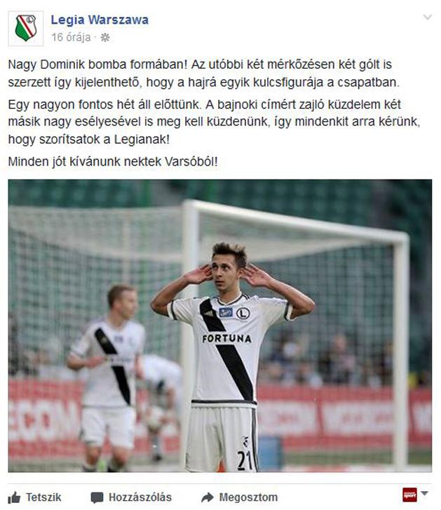 Nagy Dominik bombaformában van, csapata, a Legia Warszawa pedig ennek apropóján hétközben megszólította a magyar szurkolókat is.