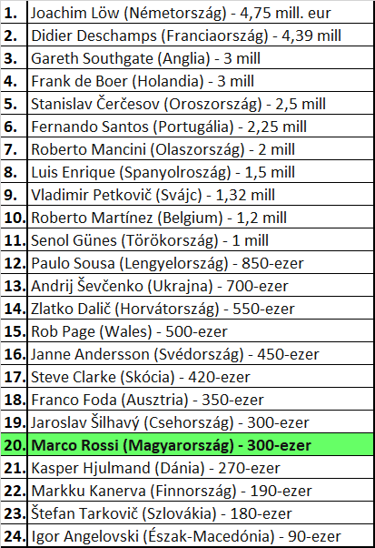 A tornán 24 nemzeti csapat vett részt, így a rangsorban ezen országok szövetségi kapitányainak fizetését vették figyelembe és rangsorolták azt. Nem túl meglepő, hogy a legtöbbet a németek költik erre a célra – a torna után búcsúzó Joachim Löw havonta nagyjából 400 ezer eurót keres, ami éves szinten 4,75 milliós bevételt jelent.