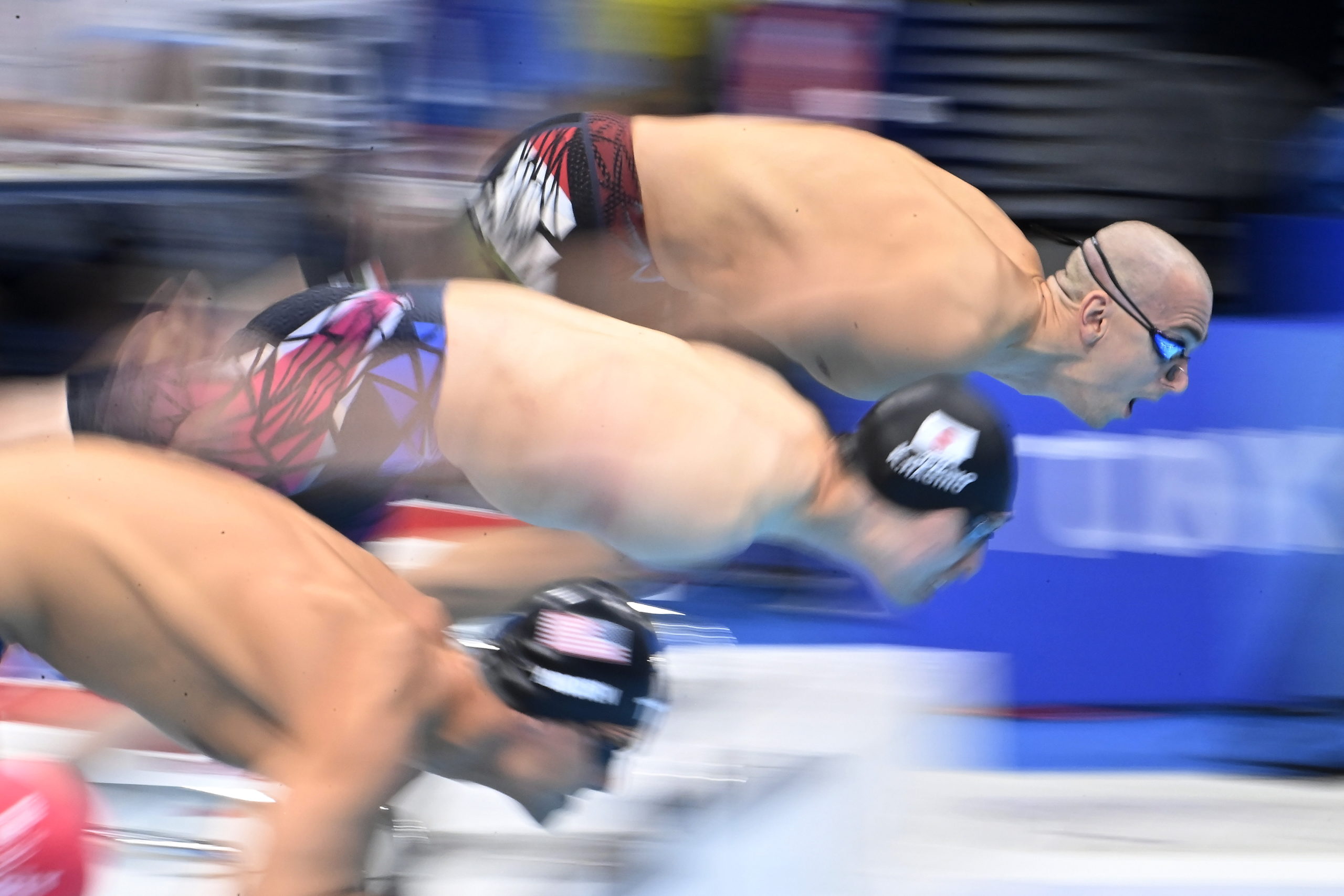 A késõbbi hetedik Cseh László (hátul) a férfi 200 méteres vegyesúszás döntõjében a világméretû koronavírus-járvány miatt 2021-re halasztott 2020-as tokiói nyári olimpián a Tokiói Vizesközpontban 2021. július 30-án.