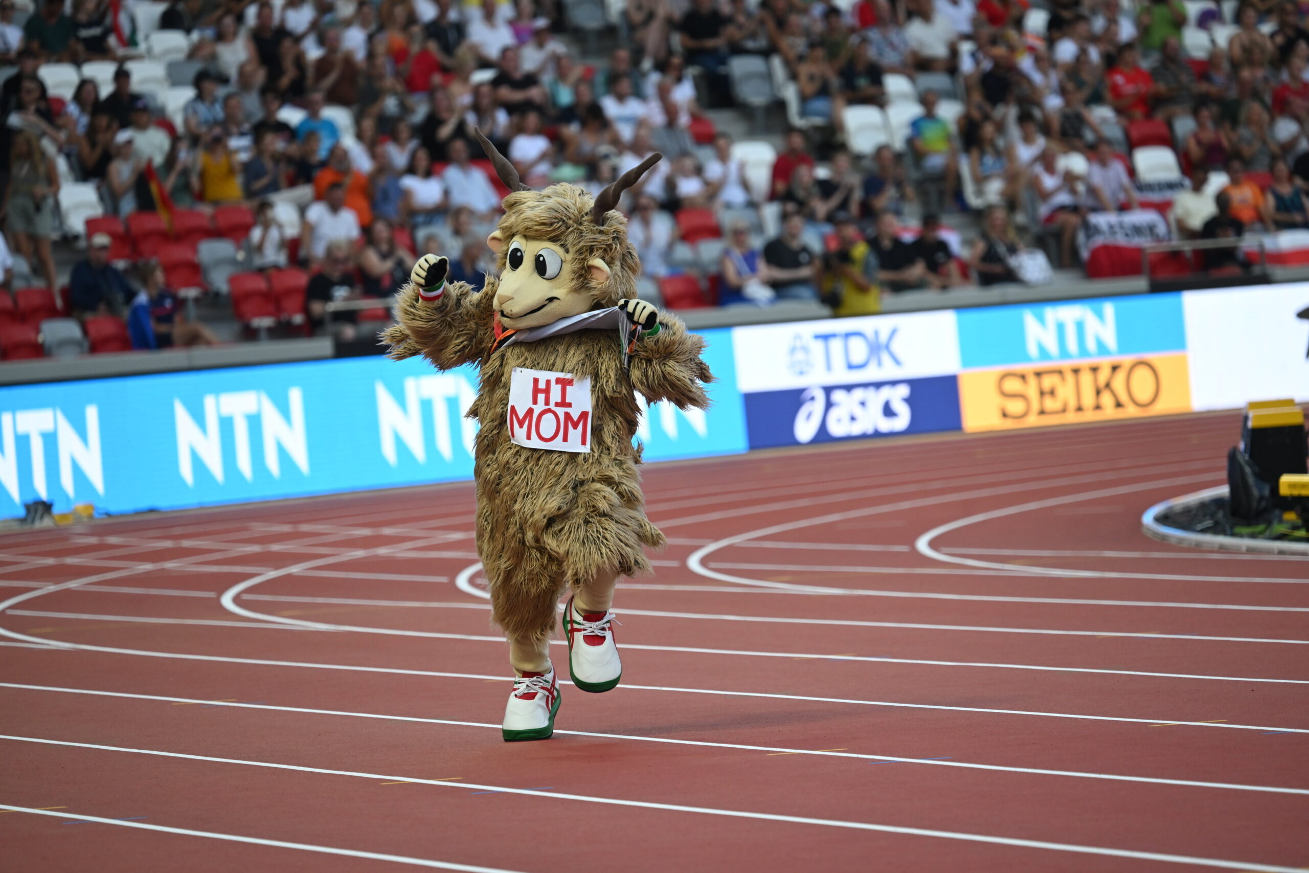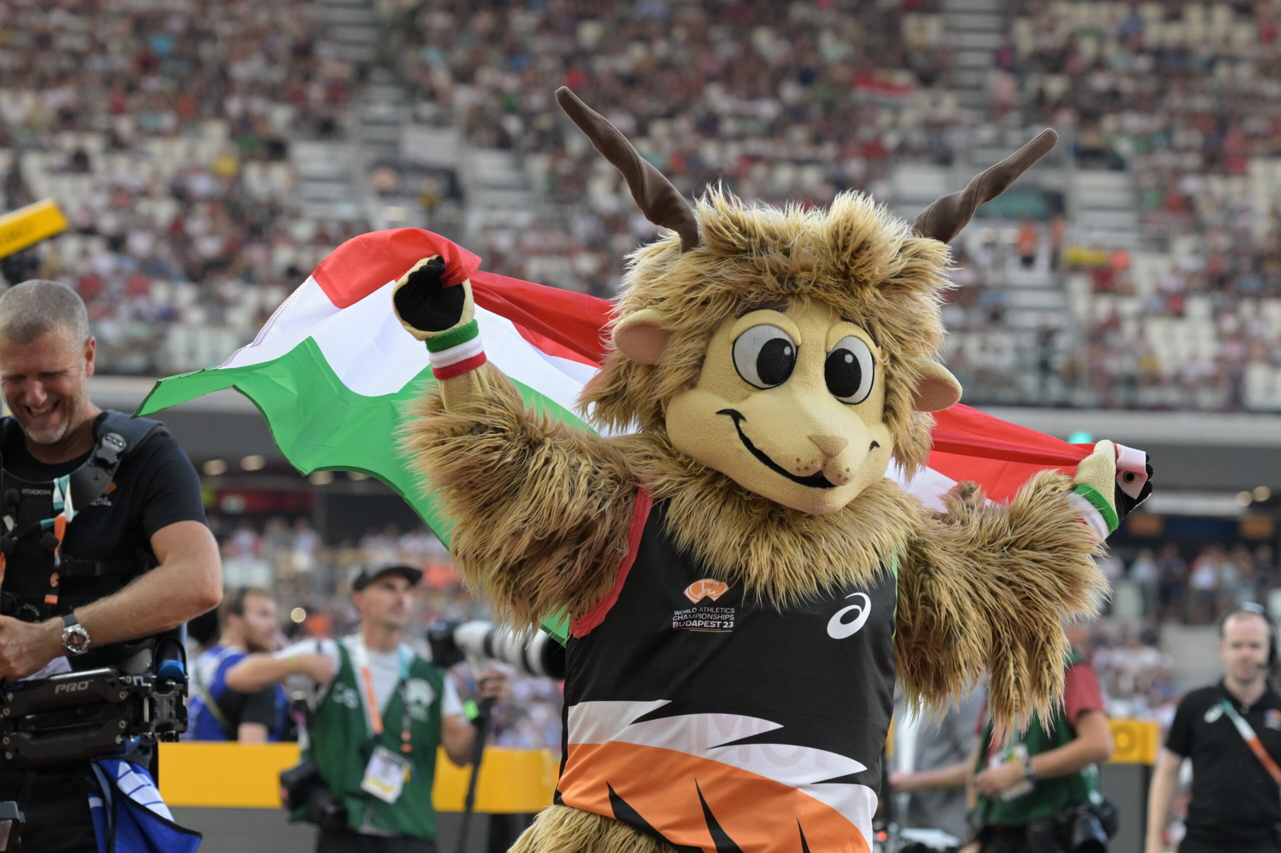 Az atlétikai világbajnokság kabalafigurája, Youhuu, a verseny nyitóünnepségén a Nemzeti Atlétikai Központban 2023. augusztus 19-én.