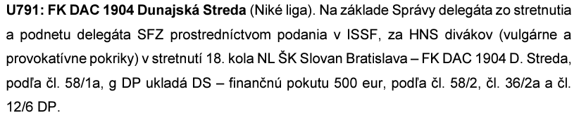 Ugyanezen jegyzékben olvashatjuk azt is, hogy a meccs miatt megbüntetik a DAC-ot is, amiért szurkolói vulgárisan és provokatívan nyilvánultak meg a mérkőzés alatt. A klubnak 500 eurót kell kifizetnie birságként.