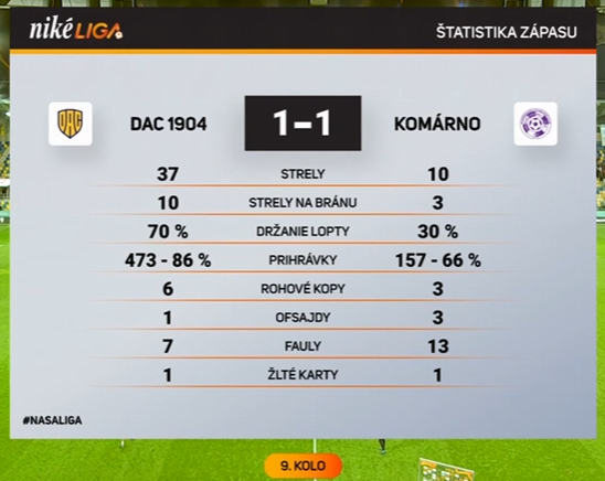 1:1-es döntetlent játszott a DAC és a Komáromi FC a dunaszerdahelyi Mol Arénában. A DAC megtartotta hazai veretlenségi sorozatát, a KFC pedig az idényben most először döntetlent játszott.