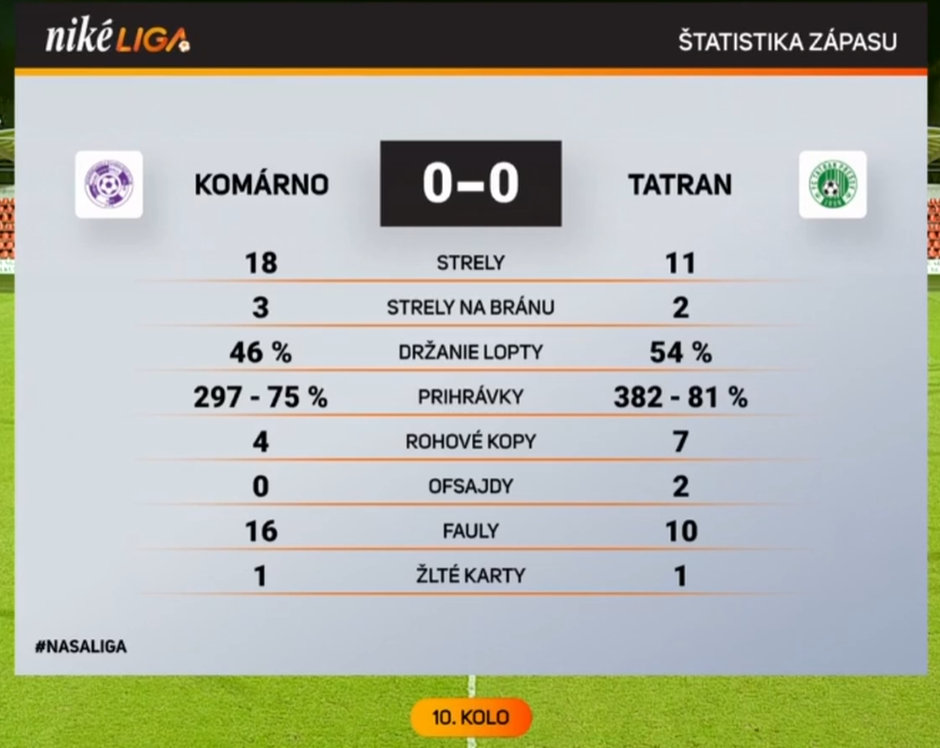 Gólnélküli döntetlennel ért véget a Komáromi FC – FC Tatran Prešov bajnoki mérkőzés a Niké Liga 10. fordulójában. A tabellaszomszédok csatája így nem változtatott a helyezések eddigi állásán.