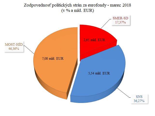 A politikai pártok által vállalt felelősség az uniós források felett – 2018 márciusa (százalékban és milliárdnyi euróban kifejezve).