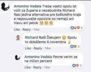 Az alábbi komment-váltás a Facebookon megyei választások előtt történt. Antonino Vadala nyíltan támogatta Richard Raši (Smer) kassai megyefőnök-jelöltet, akit a Smer az új kormányban miniszterelnök-helyettesnek javasol.