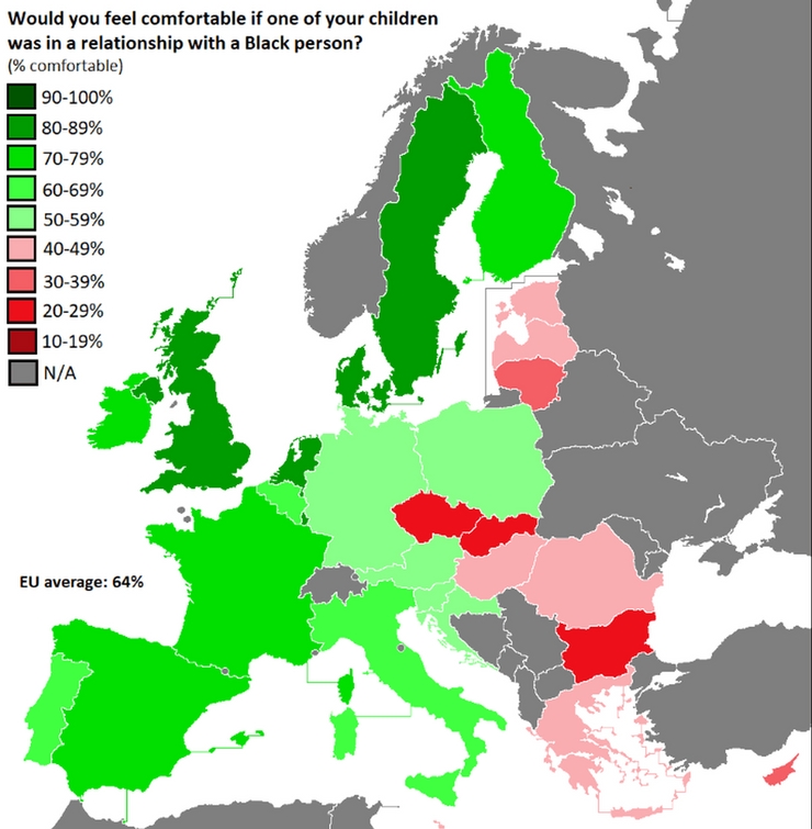 A legtoleránsabban a svédek (89 %) viszonyulnának egy ilyen kapcsolathoz, míg a bolgárok (21 %), a csehek és a szlovákok (23 %) nem lennének túlságosan toleránsak, ha a gyermekük egy fekete férfifal, illetve nővel létesítene kapcsolatot.