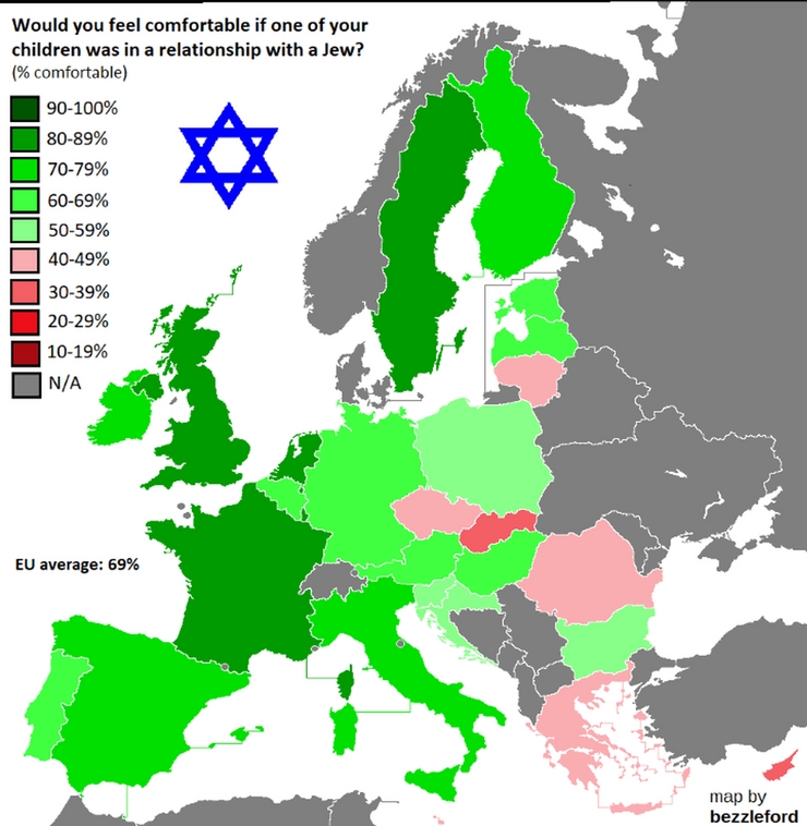Gyermeke zsidó származású partnerét leginkább a svédek (87 %) , a franciák és a hollandok (81 %) támogatnák, míg legkevésbé a ciprusiak és a szlovákok (36 %).