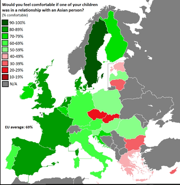 A legelnézőbbek ismét a svédek (92 %) lennének, utánuk következnek a luxemburgiak, a franciák, a dánok és a hollandok. Akik kevésbé szívesen látnának egy ázsiai menyecskét vagy vejet a családban, azok a csehek, a szlovákok, a bolgárok, a ciprusiak és a litvánok.