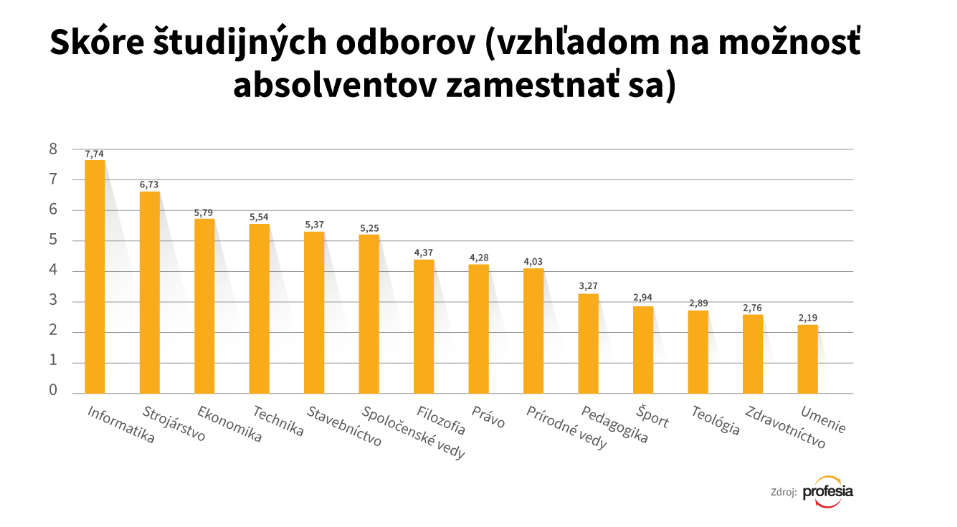 A legkeresettebb szakmák az informatikával kapcsolatosak – egy informatikus végzettségű jelentkező életrajzát átlagosan nyolc munkaadó nézi meg. Az informatika után a gépészet és a közgazdaságtan következik. A keresettség szempontjából az utolsó három helyen a teológia, az egészségügy és a művészet áll. „A művészeti végzettséggel rendelkező jelentkezők életrajzát átlagosan két vállalat nézi meg a Profesia.sk portálon“ – derül ki a Profesia.sk adataiból.