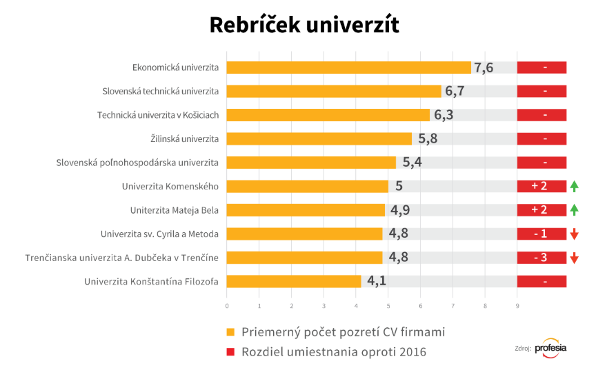 A Pozsonyi Közgazdasági Egyetem után a pozsonyi és a kassai műszaki egyetemek érték el a legjobb helyezést. A pozsonyi Comenius Egyetemet a Profesia által felállított ranglistán még a Zsolnai Egyetem és a Szlovák Mezőgazdasági Egyetem is megelőzte, így csupán a hatodik helyen végzett.
