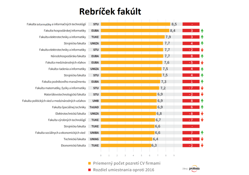 A Profesia.sk munkaügyi portál már tizenegy éve készíti el a legkeresettebb egyetemek és karok ranglistáját. Az adott egyetem vagy kar helyezése attól függ, hogy a Profesia.sk portálon közzétett, a végzősök által benyújtott életrajzokat hány munkaadó tekinti meg.