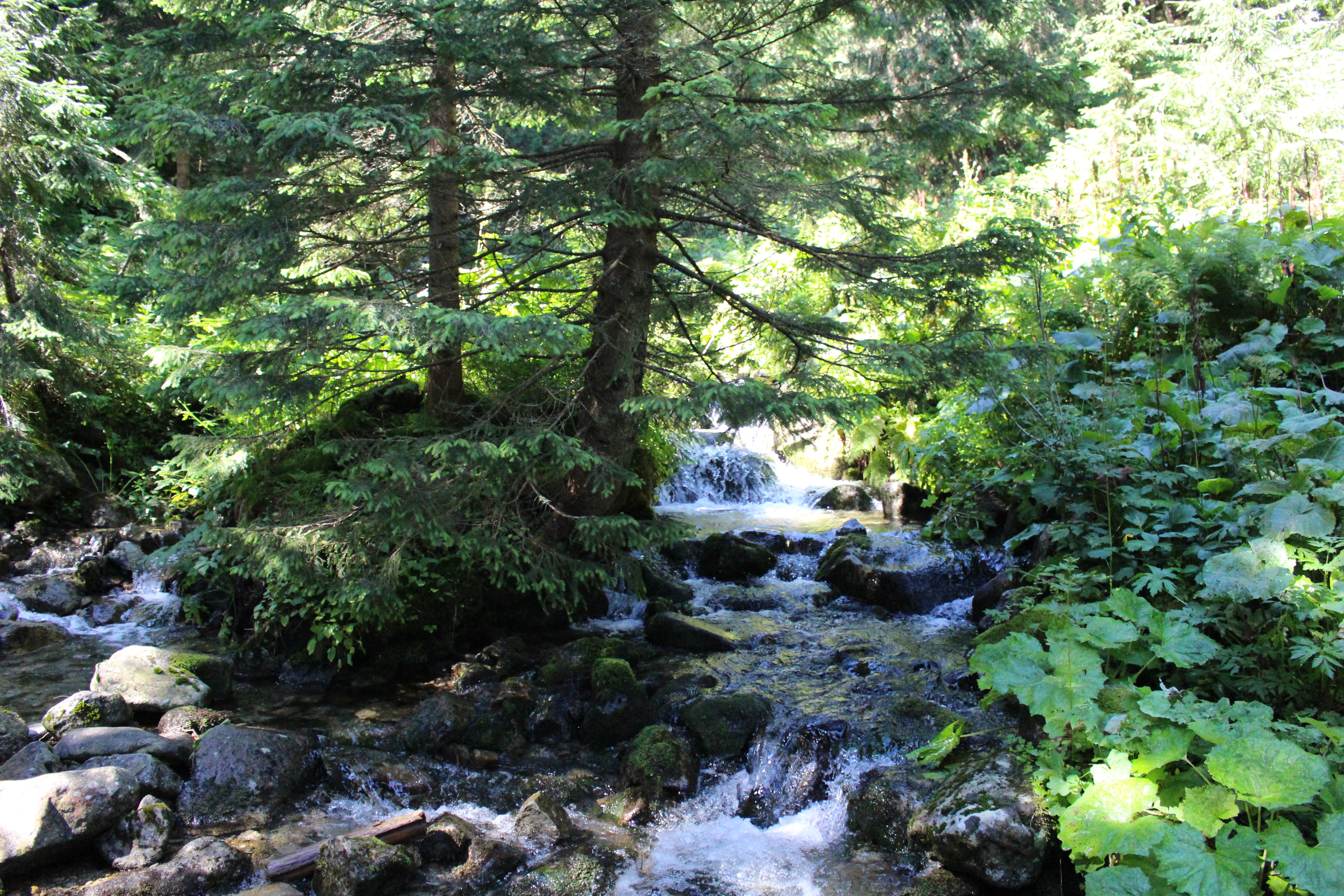 A túra első szakasza nagyon baráti és idillikus – a piros jelzésen át minimális emelkedőkön keresztül vezet az út az igazi tátrai dzsungelbe: a növényzet térdig ér, ráadásul egy patakot kell követni, ami néha egyenesen a lábunk alatt folyik – nem árt olyan lábbelit vinni, ami nem ázik át az első öt percben.