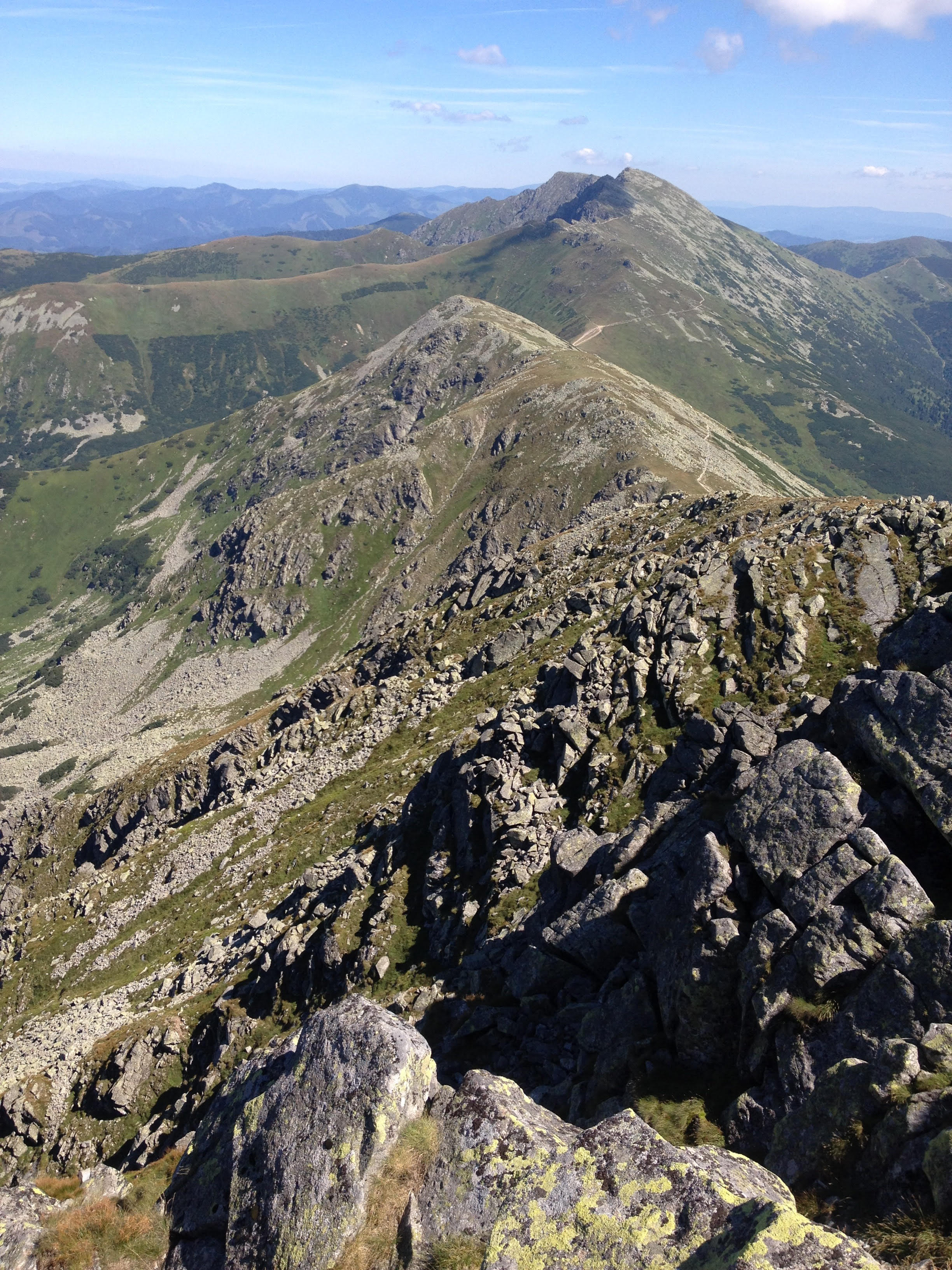 A Chopoktól nagyjából négy kilométerre légvonalban ott volt a Ďumbier is, ami 19 méterrel nőtte túl az általunk megmászott csúcsot, ezzel birtokolja az Alacsony-Tátra legmagasabb pontja megtisztelő címét. A Chopokról szinte egyenes út vezet tovább a gerincen a Ďumbierre, ám a két órával korábban megtanult lecke azt mondatta velem, hogy késő délután már ne vágjunk neki a karnyújtásnyira található csúcsnak.
