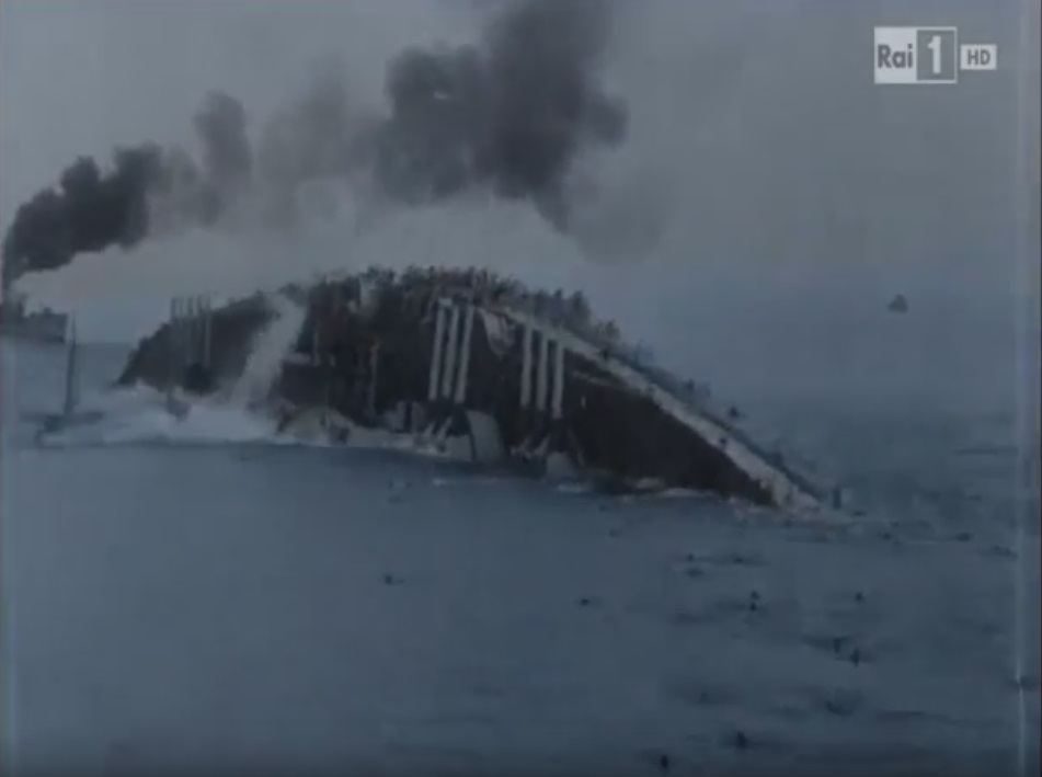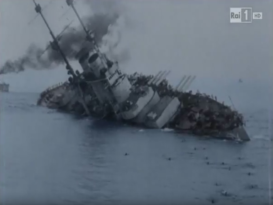 A „Szent István” utolsó pillanatai. A hajó felborulása 2.30-től látható. (A „Gli eroi del mare nostro” [Tengerünk hősei] című filmből -1927. Az olaszok a háború után több jelenetet újrajátszottak és az eredeti felvételeket eltúlzó propagandaanyaggal keverték. Luigi Rizzo nagy beleéléssel mutatta be