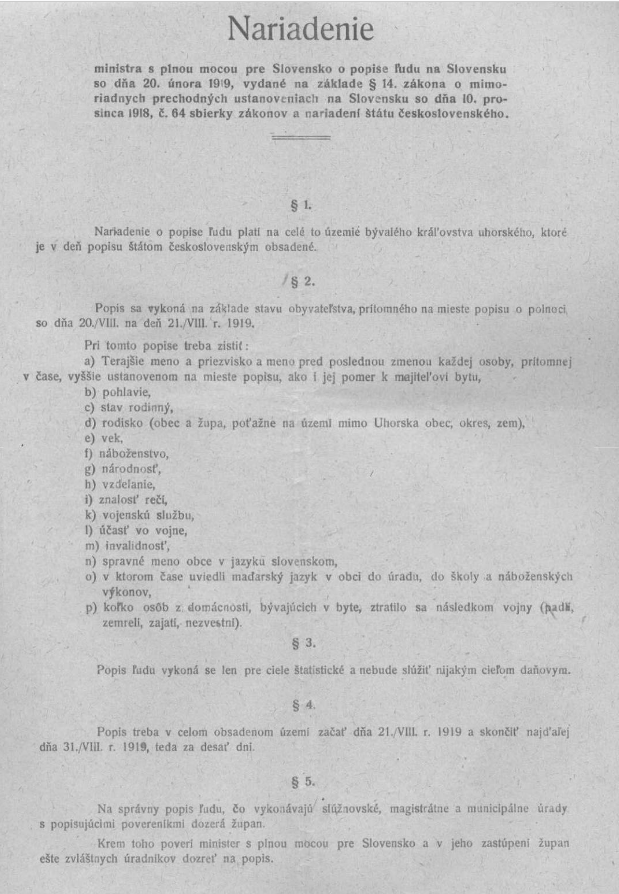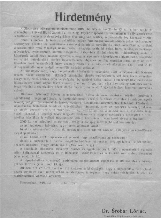 A népösszeírás részleteit a Losonci Újság 1919. márciusi 27-i 12. száma ismertette: „Dr. Šrobár szlovák miniszter rendelete értelmében népösszeírás lesz, melynél meg lesz állapítva főleg a mostani elő és utónév, valamint a magyarosítás előtti nem, a család állapot, szülőhely, kor nemzetiség, nyelvismeret, vallás, műveltség, katonai szolgálat, e háborúban való részvétel, rokkantság. Meg lesz állapítva továbbá az illető község neve tót nyelven és az az idő, amióta a magyar nyelv be lett vezetve a hivatalokba, iskolákba és templomokba.”