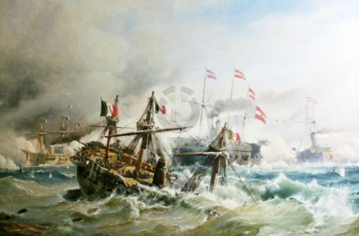 Nyitókép: Tegetthoff zászlóshajója, az „SMS Ferdinand Max” meglékeli az olasz „Re d’Italia” páncélozott fregattot (HGM – fotó: Orbán)