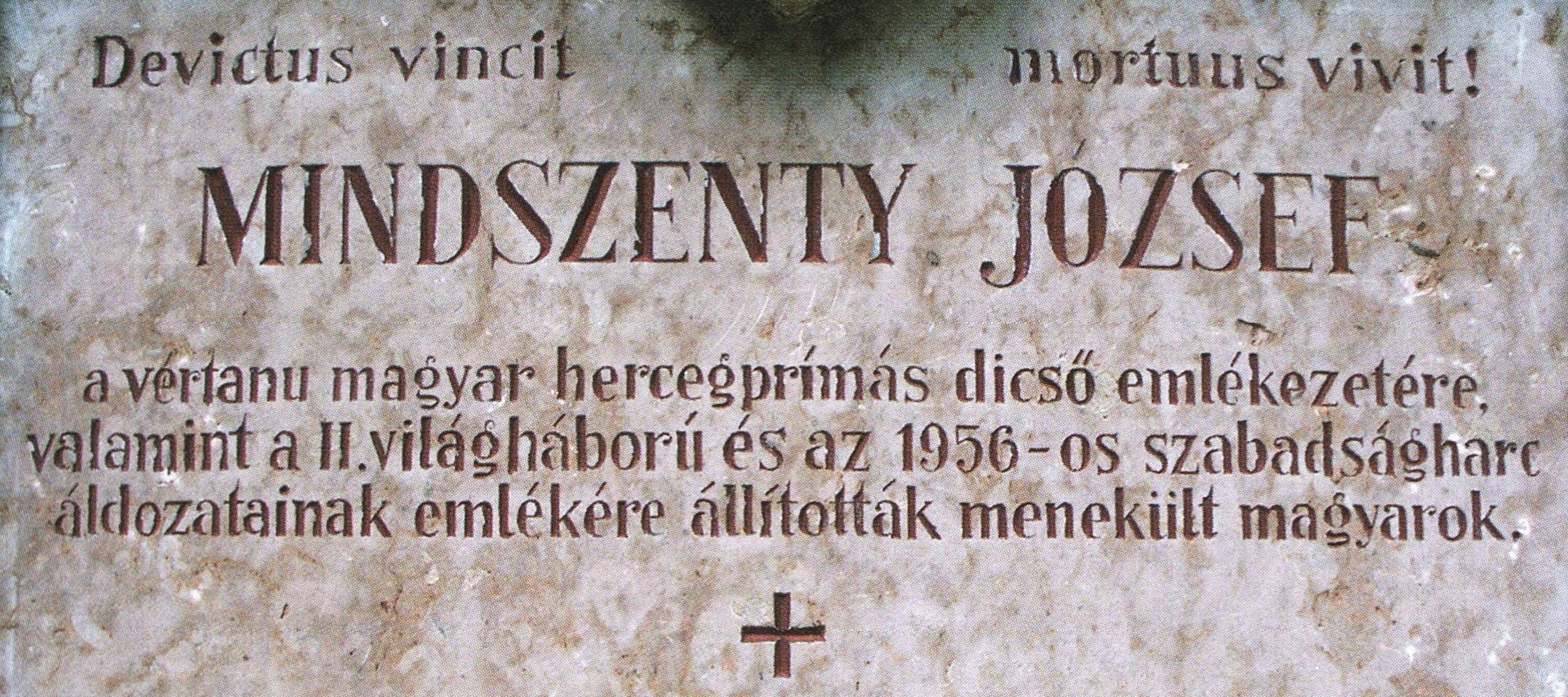 Mindszenty József, a vértanú magyar hercegprímás dicső emlékezetére; a második világháború és az 1956-os szabadságharc áldozatainak emlékére állították menekült magyarok 1977-ben.
