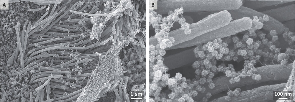 A felvételek egy laboratóriumban készültek azután, hogy az Észak-Karolinai Egyetemen Camille Ehre tüdőgyógyász a kollégáival együtt egy kémcsőben SARS-CoV-2 vírussal fertőzte meg a tüdőt körülvevő sejteket.