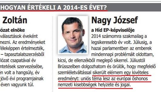 A sors fintora egyébként, hogy az őshonos európai kisebbségek ügye azon a 2012. októberi bukaresti kongresszuson került be az Európai Néppárt programjába az RMDSZ és az MKP jelenlétében, ahol és amikor Nagy József Most-Hídja még csak nem is volt tagja az Európai Néppártnak.