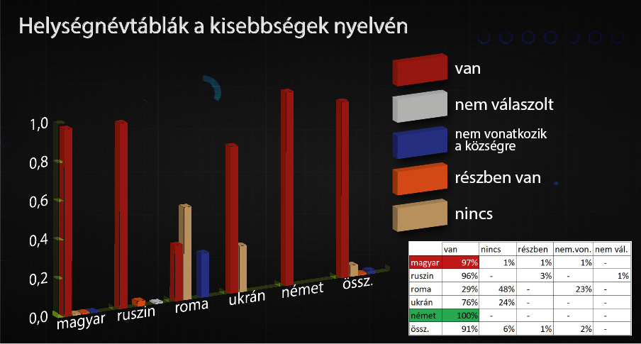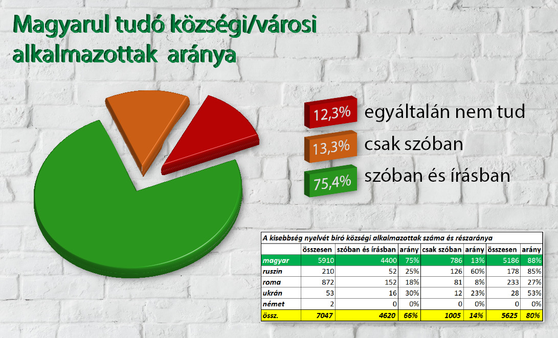 A felmérés szerint a vizsgált 638 település több mint 7000 alkalmazottja közül 4500-an (cca. 65 százalék) bírja az adott kisebbség nyelvét legalább szóban. A magyarlakta települések esetében a legjobb az arány: az alkalmazottak 88 százaléka legalább beszél magyarul (75 százalékuk szóban és írásban is bírja a magyar nyelvet). Ez az előző évek felméréseihez képest nem mutat előrelépést.