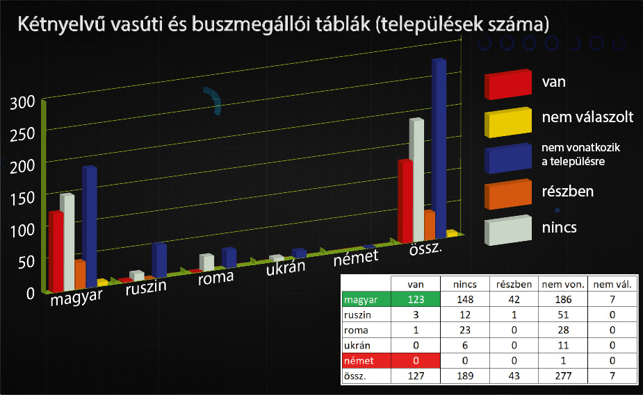 Pozitívum, hogy a jelentés szerint kétszeresére nőtt a kétnyelvű vasúti és buszmegállói táblákat használó községek száma: számuk 65-ről 127-re emelkedett – ebből 23 volt magyarlakta település. Ez esetben 277 település jelezte, hogy rá nem vonatkozik rá a kérdés, vagyis magyar viszonylatban nagyjából az érintett községek harmada rendelkezik csak magyar vasúti és buszmegállói feliratokkal.